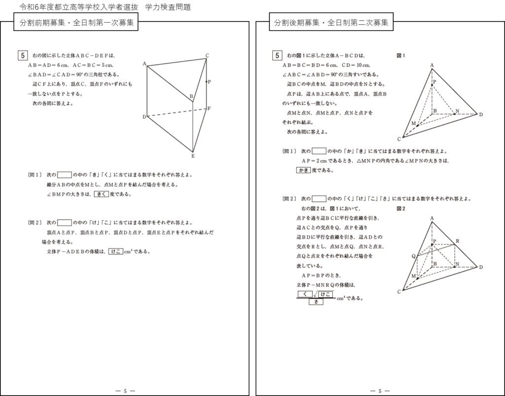 大問5では、空間図形における角度や立体の体積を求める問題が出題されます。