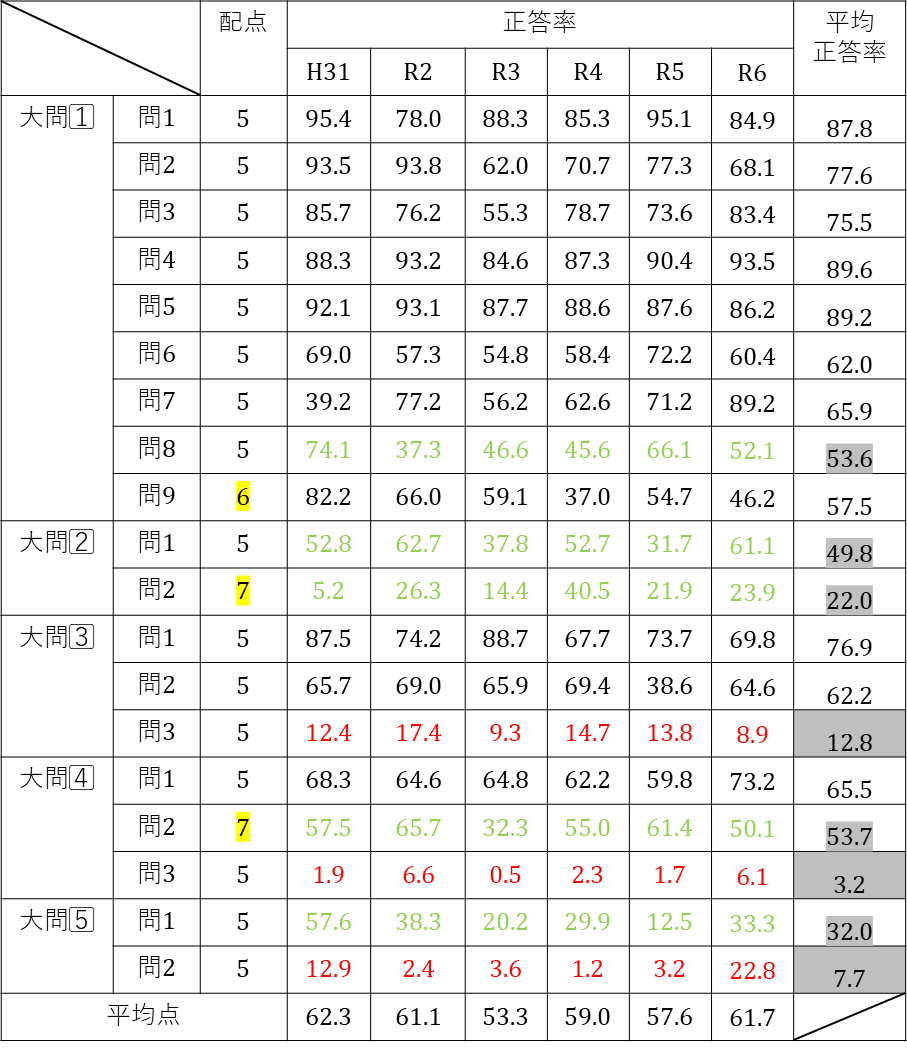 毎年形式が少し異なるため、苦手な方も多いですが、今年度は比較的易しい問題で、正答率は42.5%でした。