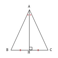 二等辺三角形の頂角Aと底辺BCの中点Hを結んだ線分AHは、底辺BCに垂直に交わる。